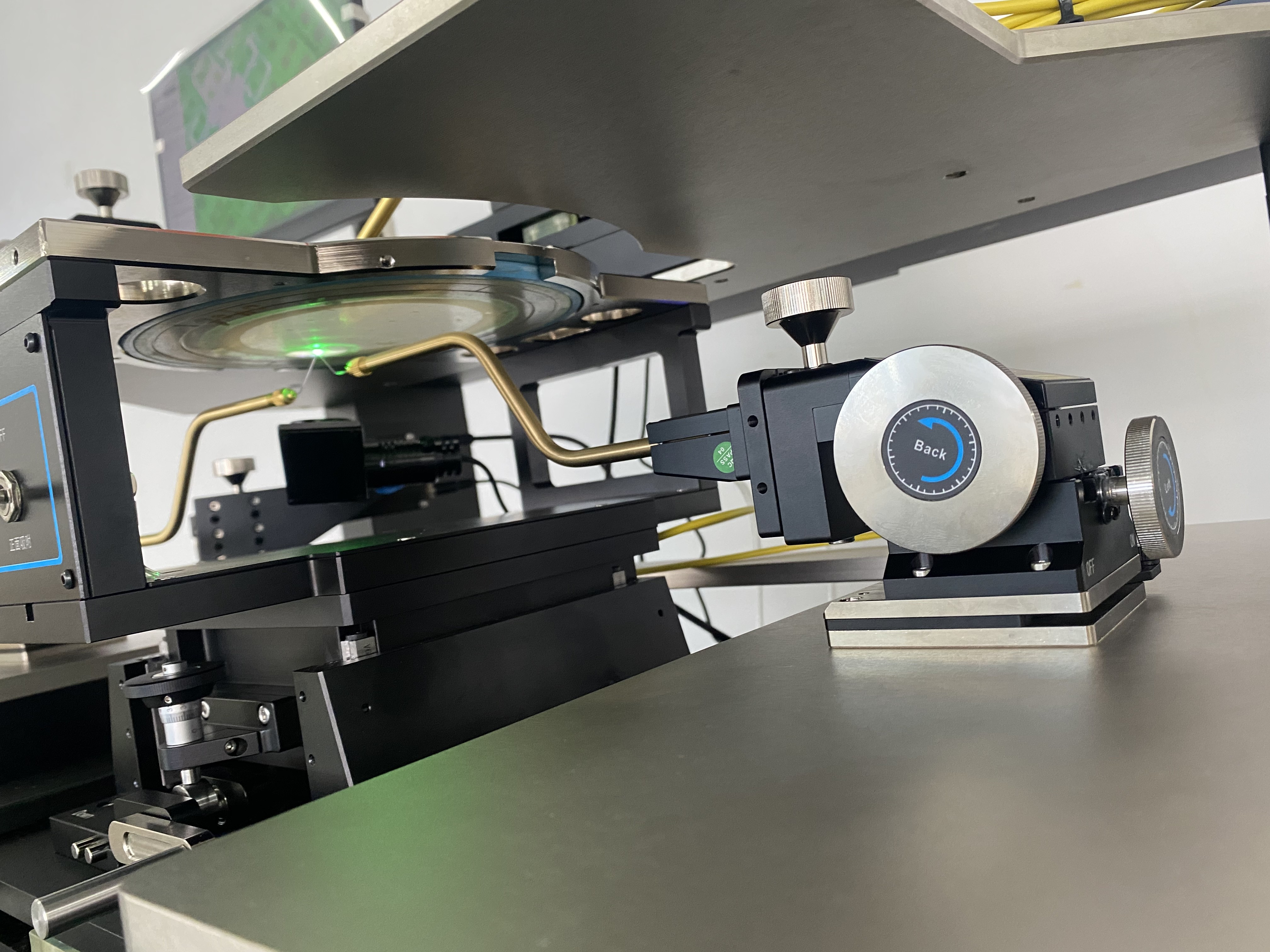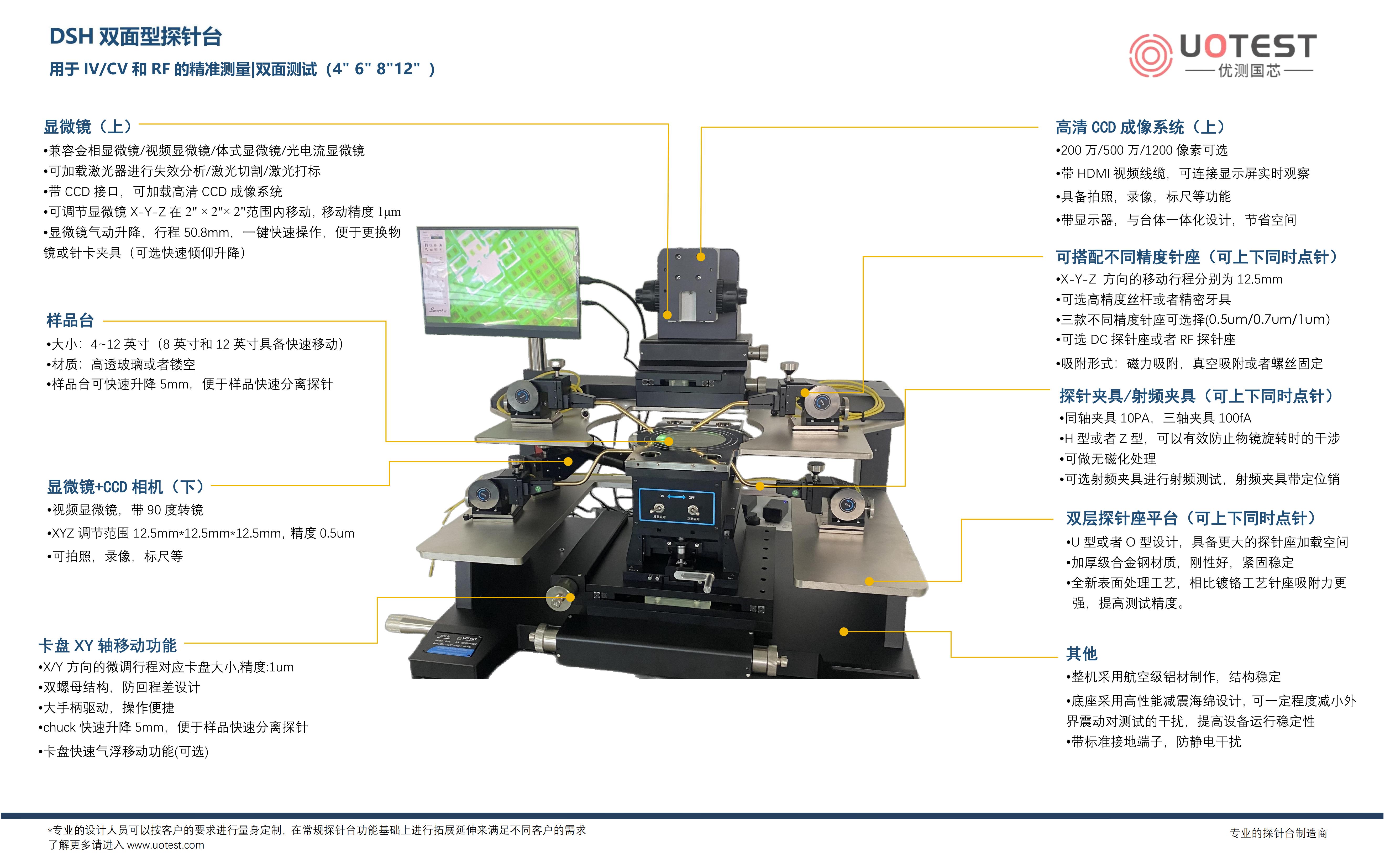 DSH系列探針臺是我司自主研發(fā)的一款雙面探針臺, 最大可完成12英寸晶圓的正反面點針測試。在具備常規(guī)探針臺的功能基礎(chǔ)上,可用于晶圓或者PCB板的測試,對晶圓或者PCB板正面和背面同時扎針以實現(xiàn)各種光/電性能測試需求的測試,或背面點針,正面收集光線等,運用十分豐富。該定制探針臺具有優(yōu)良的機械系統(tǒng),穩(wěn)定的結(jié)構(gòu),符合人體工程學,以及多項升級功能。此設(shè)備在激光器,LD/LED/PD的光強/波長測試等方面得到了廣泛運用。如果您的產(chǎn)品也有雙面點針,或者背面點針的需求,此款產(chǎn)品是首選。