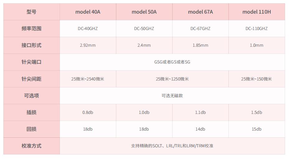 40A-GSG-150-DP,代表的意思為:頻率最高40G,GSG三個端口,G代表接地端,S代表信號端,150代表G和S之間的距離是150um,DP代表style形狀。