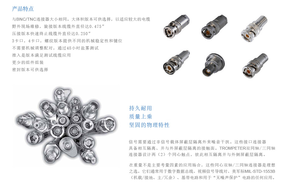 Trompeter/Cinch Connectivity Solutions軍事和航空航天射頻連接器提供最高質(zhì)量的信號完整性,適用于最嚴苛的應用。這些產(chǎn)品達到或超過所有適用的軍事性能規(guī)格,包含元件數(shù)量少,易于組裝。Cinch 軍事和航空航天射頻連接器可提供組裝連接器所需要的各種工具。